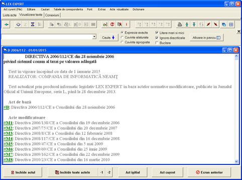 Şi în legislaţia Uniunii Europene întâlnim totuşi un număr mare de acte ulterioare care operează modificări asupra unui act european. Din acest motiv a fost necesar ca şi pentru legislaţia Uniunii Europene să includem în cadrul produsului LEX EXPERT forme actualizate la zi (versiuni consolidate), care să includă în text toate modificările efectuate unui act.