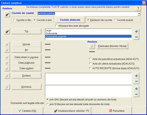 Criteriile de căutare sunt foarte diverse: domeniu/subdomeniu, număr act, tip, emitent, data emiterii, data publicării, data intrării în vigoare, Monitorul Oficial în care a fost publicat actul respectiv, cuvinte în titlu sau cuvinte în text.